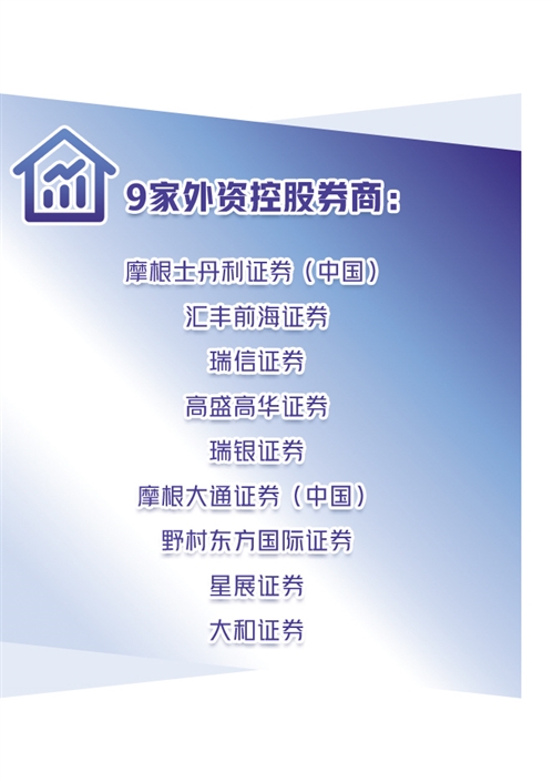 截至目前,外資控股券商已達(dá)到9家,分別為摩根士丹利證券(中國)、匯豐前海證券、瑞信證券、高盛高華證券、瑞銀證券、摩根大通證券(中國)、野村東方國際證券、星展證券和大和證券。