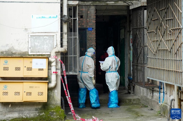 11月4日,在重慶九龍坡區(qū)九龍街道,兩名身穿防護(hù)服的青年志愿者準(zhǔn)備入戶(hù)核對(duì)信息。