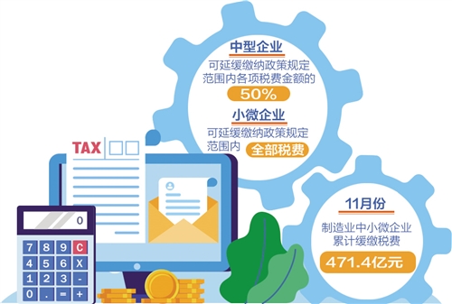 剛剛過去的11月是制造業(yè)中小微企業(yè)階段性稅收緩繳政策實施首月。12月1日,國家稅務(wù)總局發(fā)布統(tǒng)計數(shù)據(jù)顯示,這項政策實施效果顯著,制造業(yè)中小微企業(yè)已累計緩繳稅費471.4億元。