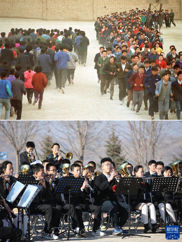 拼版照片:上圖為2001年,會寧縣二中學(xué)生跑步鍛煉身體(新華社記者 武斌 攝);下圖為2022年1月19日,會寧縣會師中學(xué)交響管樂團學(xué)生在戶外表演交響樂(新華社記者 馬希平 攝)。