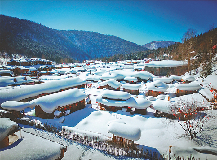 此時(shí)的雪鄉(xiāng),飄落的雪花正在屋頂、柴垛上翩翩起舞,為世人再現(xiàn)了童話(huà)中的冰雪王國(guó)。走在雪韻大街上,穿著花襖,左手冰糖葫蘆,右手雪糕,雙腳踩在松軟的雪堆上吱吱作響;坐一趟馬拉爬犁尋找兒時(shí)快樂(lè);吃一回鐵鍋燉感受東北風(fēng)情;爬一次羊草山看日出東方……這里的雪景,每一幀都攝人心魄,藏著你我心中向往的詩(shī)與遠(yuǎn)方。