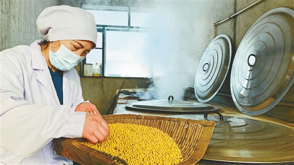漫長的歲月,手藝人不斷積累經驗,對豆子在發(fā)酵過程中不斷變化的溫度、色澤、香氣等有了直覺判斷,才讓胡曉華的手工大醬保存了讓人認可的老味道。經常有人慕名找她咨詢,“我家大醬為啥不發(fā)酵?”“大醬酸了咋辦?”……她都一一耐心地解答。