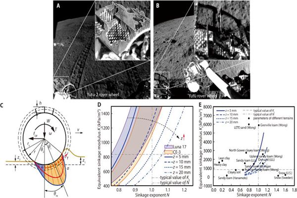團(tuán)隊(duì)成員根據(jù)月球車車輪與月面作用的信息和地面力學(xué)模型估計了月壤的力學(xué)特性,結(jié)果表明,月壤風(fēng)化層的承壓特性與地球上的干沙和沙壤土類似,與美國阿波羅計劃中的典型月壤相比具有更強(qiáng)的承壓特性。在多個不同地點(diǎn)的圖像中,觀察到“玉兔二號”車輪粘附有大塊團(tuán)狀土壤,而“玉兔號”車輪基本不存在粘土現(xiàn)象,這表明,嫦娥四號著陸區(qū)附近月壤內(nèi)聚力較大,其原因可能是包含較高比例的凝集物,使土壤顆粒經(jīng)車輪碾壓更易團(tuán)聚。