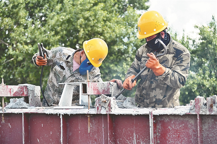 身處建設(shè)現(xiàn)場,記者聽到最美的聲音就是各種機器的嗡鳴。順著電鉆的嗡嗡聲,記者看向一棟3層建筑。劉明軍介紹,這棟建筑是身兼展示功能的辦公樓,正在進行外幕墻裝飾。與之相鄰的二層建筑上,工人們正忙著進行二次結(jié)構(gòu)砌筑。