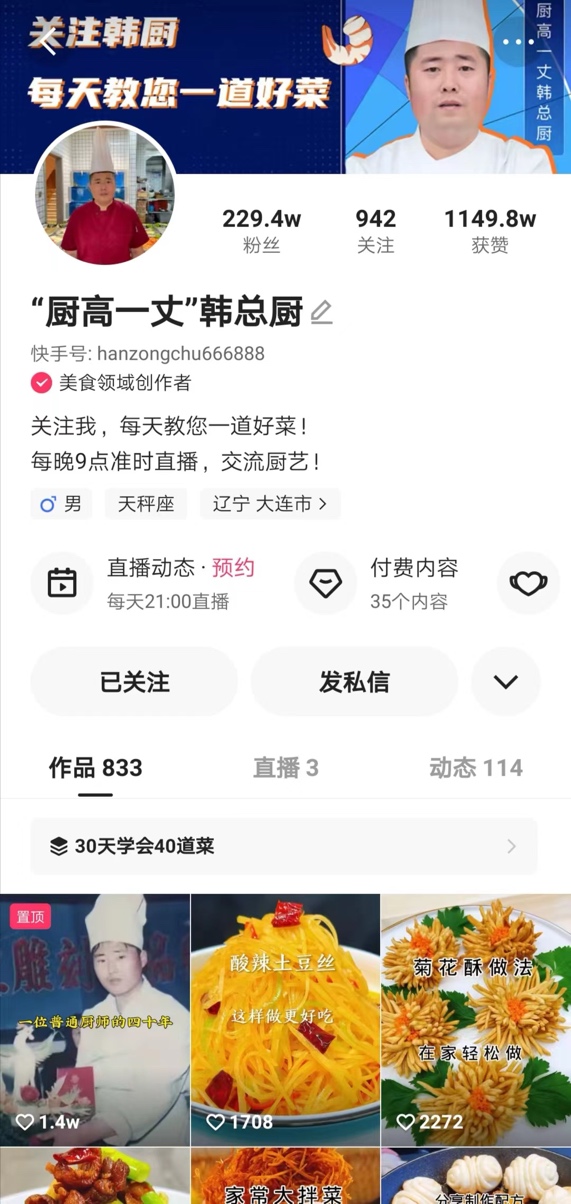 作為一位有著25年美食領(lǐng)域從業(yè)經(jīng)驗(yàn)的老廚師,韓總廚憑借一手精湛的廚藝,來到快手后很快就積累了上萬粉絲,為他打造付費(fèi)課程奠定了基礎(chǔ)?!皩?duì)比了其他達(dá)人的內(nèi)容,我覺得自己還是有一定的內(nèi)容優(yōu)勢(shì)的,所以也試著做了課程,看看是否有人愿意購買?!?