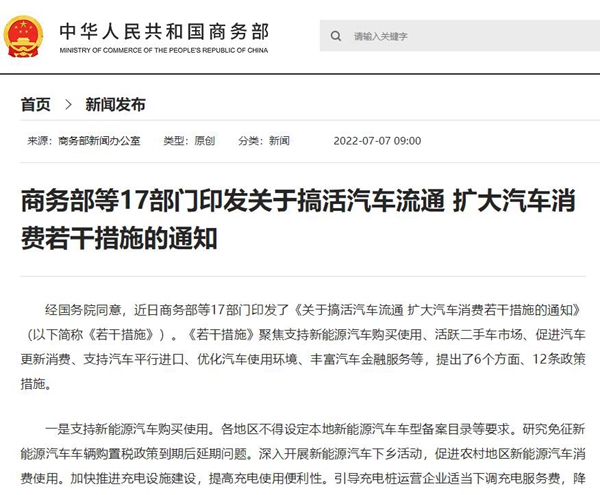 日前,商務(wù)部等17部門印發(fā)了《關(guān)于搞活汽車流通 擴(kuò)大汽車消費(fèi)若干措施的通知》,《措施》聚焦支持新能源汽車購買使用、活躍二手車市場(chǎng)、促進(jìn)汽車更新消費(fèi)、支持汽車平行進(jìn)口、優(yōu)化汽車使用環(huán)境、豐富汽車金融服務(wù)等,提出了6個(gè)方面、12條政策措施。