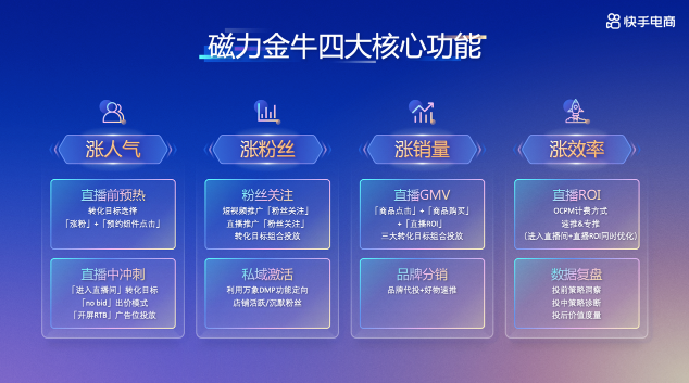 本次活動,快手磁力金牛和快手電商服務商也宣布推出一系列政策,推動常熟女裝商家電商生意增長。作為電商生意的加速器,快手磁力金牛讓商家投流更精準、效率更高、效果更好。在賬號啟動期,商家可借助磁力金牛進行私域起量,并根據(jù)貨盤制定營銷策略;在賬號成長期,商家可依據(jù)S-A-B直播策略模型,使用磁力金牛進行差異化投流、精細化運營;在賬號成熟期,磁力金牛可以在品效協(xié)同下進行差異化拓客,引入新流量。