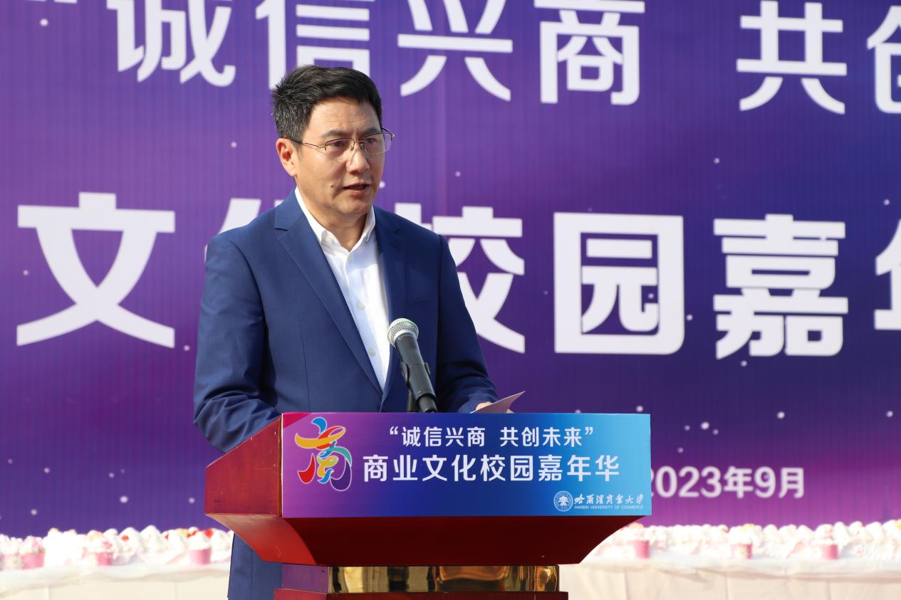 哈爾濱商業(yè)大學黨委書記孫先民致辭。他表示,誠信“軟實力”為高質(zhì)量發(fā)展提供“硬支撐”。本屆“誠信興商·共創(chuàng)未來”商業(yè)文化校園嘉年華活動堅持以文化力量啟智潤心、固本培元,是深入學習貫徹習近平總書記在主持召開新時代推動東北全面振興座談會和視察我省時的重要講話重要指示精神,全面落實立德樹人根本任務(wù)的務(wù)實舉措。哈爾濱商業(yè)大學作為新中國第一所多科性商業(yè)大學,始終堅持“大商鑄才、大雅育人、商雅兼?zhèn)洹⒔?jīng)世濟民”的育人理念,厚植師生“心懷祖國,至誠奉獻,以商弘業(yè),矢志一流”的大商之道?;顒訉⒊浞职l(fā)揮老字號在文化引領(lǐng)、品牌建設(shè)、產(chǎn)業(yè)升級等方面的示范引領(lǐng)作用,彰顯龍江市場主體活力與創(chuàng)新力,聚焦建設(shè)“六個龍江”、推進“八個振興”,筑牢堅定龍江文化繁榮發(fā)展的自信根基,進一步凝聚師生扎根龍江、服務(wù)龍江、建設(shè)龍江的情懷和力量。