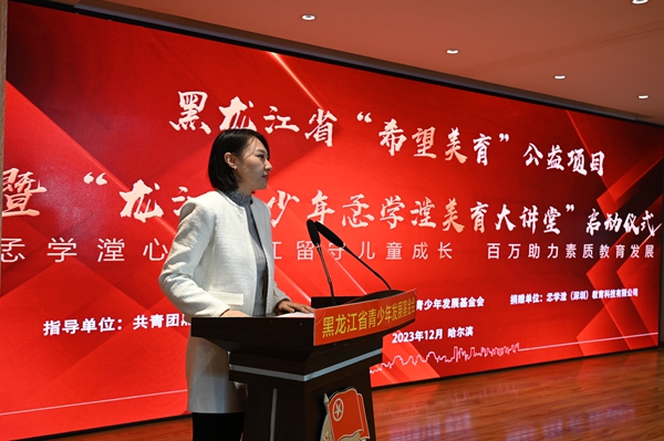 為深入貫徹習近平總書記對希望工程實施30周年的重要寄語精神,進一步提升新時代希望工程的助學育人質量,12月12日,黑龍江省“希望美育”公益項目暨“龍江青少年孞學漟美育大講堂”啟動儀式在希望大廈舉行。黑龍江省文學藝術界聯(lián)合會一級巡視員張正明,共青團黑龍江省委副書記代東力,黑龍江省青聯(lián)委員、深圳市孞學漟教育科技有限公司創(chuàng)始人楊梓杺,黑龍江省民政廳、黑龍江省青少年發(fā)展基金會等相關單位領導,嘉仁公益、益家公益代表,伙伴計劃社區(qū)代表,哈爾濱市松北區(qū)樂業(yè)小學“童心港灣”代表,哈爾濱市蘇寧紅軍小學校、哈爾濱市合眾人壽希望小學、哈爾濱新區(qū)第三學校等學校師生代表參加活動。