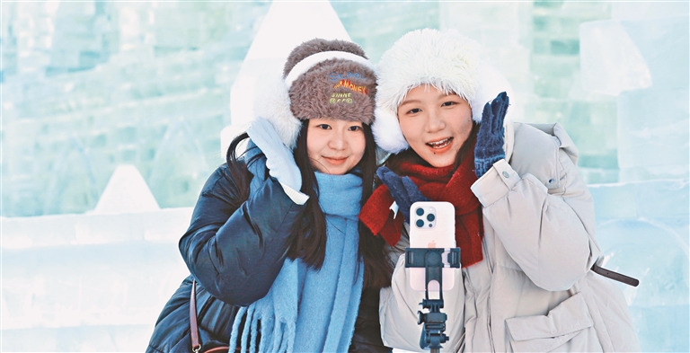 園區(qū)內(nèi)人氣火爆。大大小小的冰雪景觀姿態(tài)各異、美不勝收。游玩拍照、直播互動、品嘗美食……在這座冰雪奇幻王國里,游客盡情體驗著冰雪帶來的別樣快樂。