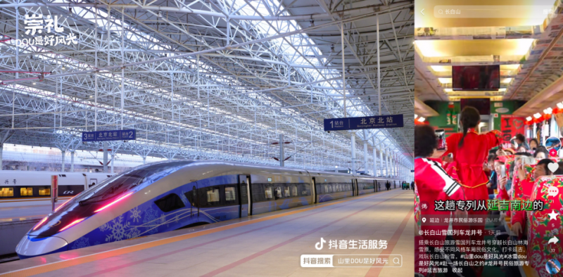 在線下,活動還聯(lián)動崇禮區(qū)政府、延邊州商務(wù)局、齊齊哈爾網(wǎng)信辦落地雪國專列,覆蓋復(fù)興號、民俗專列、高鐵站等不同場景,讓游客和市民感受濃濃冰雪氛圍,自發(fā)為當?shù)匚穆梅N草,吸引更多雪友來到小城看見好風(fēng)光。截至活動收官,“開往崇禮站的雪國專列”熱度達827萬,一度登上抖音河北多地同城榜TOP1。