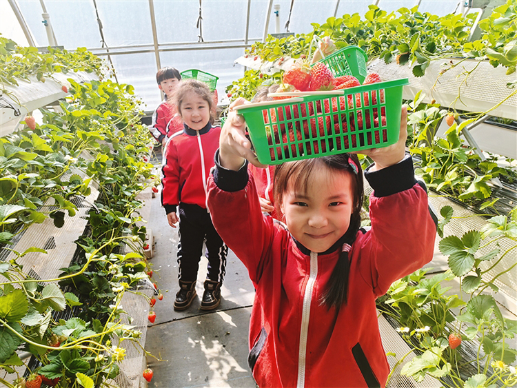 在位于陽(yáng)明區(qū)樺林鎮(zhèn)的唐櫻園生態(tài)農(nóng)場(chǎng)里,整齊排列著24棟智能溫室大棚。在11號(hào)草莓大棚里,來(lái)自同心幼兒園的小朋友正在采摘草莓,孩子們興奮地圍著草莓觀察,“草莓真好看,草莓好甜?。 ?/p>