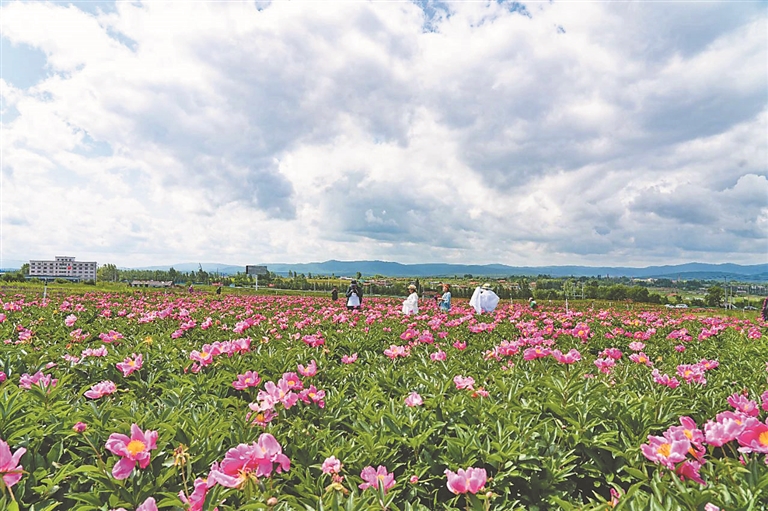 紫云嶺花海將自然美景與人文內涵深度融合,游客賞花之余,還可通過景區(qū)設置的展板了解芍藥歷史,感受“以花傳情”的東方浪漫。圖為絢爛綻放的芍藥花。