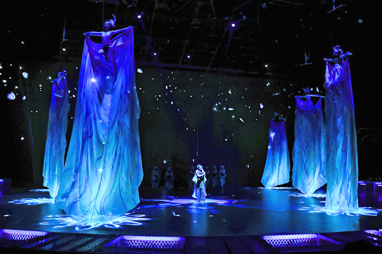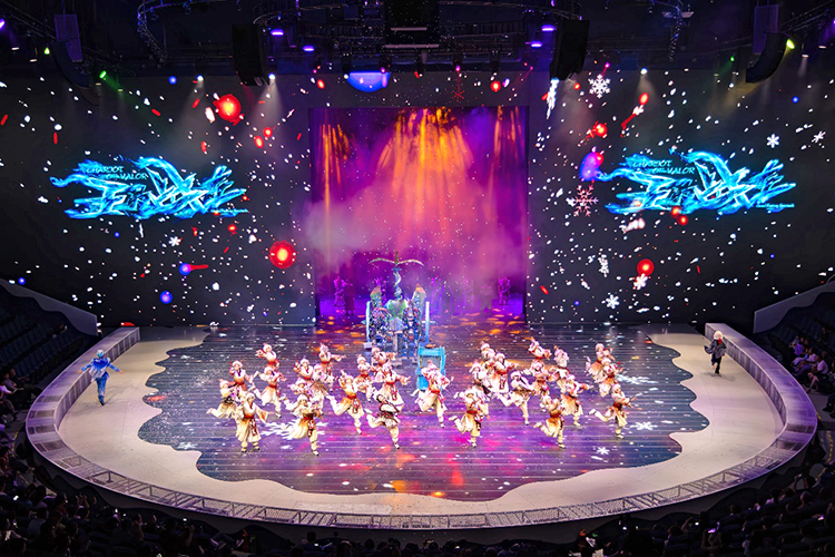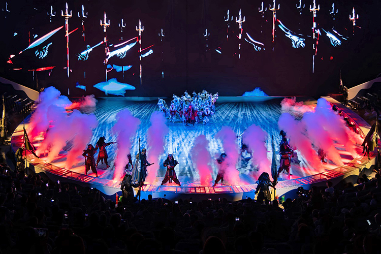 全新的演出以游戲玩家視角展開,當(dāng)游戲開始,巨大的環(huán)形地幕瞬間點(diǎn)亮,蒼茫的北境雪原鋪展開來,激光投影在穹頂交織出流動(dòng)的光幕,與升騰的煙霧交融,千年前的部落場(chǎng)景躍然眼前。