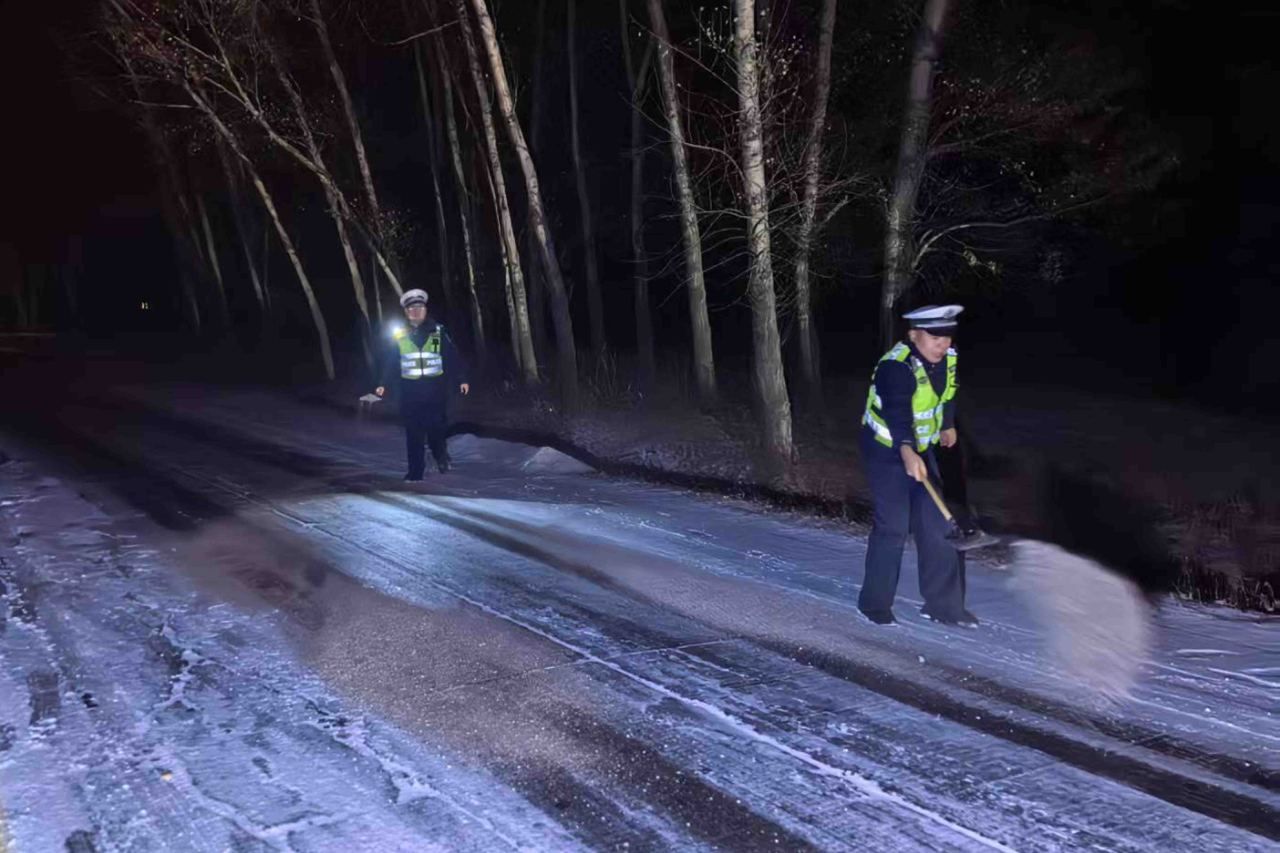 工作中,民輔警重點(diǎn)對(duì)坡道、彎道、橋梁等易結(jié)冰路段進(jìn)行巡查,針對(duì)國(guó)道坡度較大、彎道較多、易滑的結(jié)冰路段,采用“定點(diǎn)潑灑+動(dòng)態(tài)巡邏補(bǔ)撒”的方式,使用鐵鍬、掃帚等工具,向結(jié)冰路面均勻潑灑工業(yè)鹽、撒布防滑沙等防滑料,進(jìn)一步增強(qiáng)路面摩擦力,防止車輛打滑,確保路面盡快恢復(fù)安全通行條件,有效遏制交通事故的發(fā)生,全力保障群眾出行安全。同時(shí),民輔警采取定點(diǎn)執(zhí)勤與流動(dòng)巡邏相結(jié)合的方式,加強(qiáng)路面巡邏管控和指揮疏導(dǎo),利用喊話器積極提醒過(guò)往車輛保持安全車距,減速慢行,謹(jǐn)慎駕駛,確保行車安全。